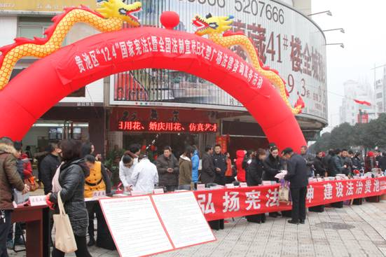 12月4日是首个国家宪法日和第14个全国法制宣传日,贵池区依法治区领导小组办公室、区委宣传部、区司法局牵头在主城区街头举办 “国家宪法日暨全国法制宣传日大型广场咨询服务活动”,全区24家单位联合参加了这次活动。樊泽明、高峰、操礼旺、尤忠祥等区领导出席活动。
