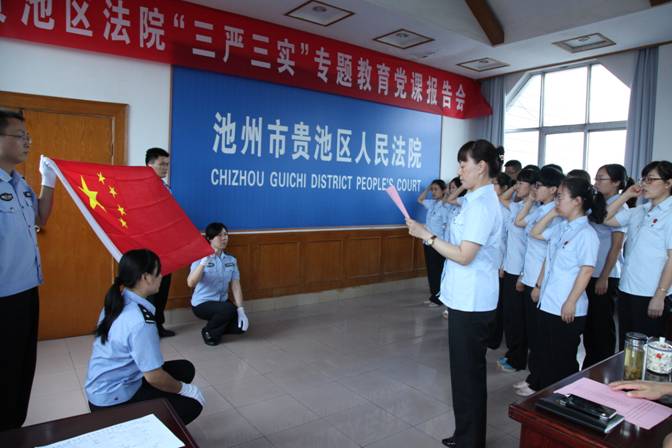 活动设置了“颂一段经典、唱一首歌曲、作一份承诺、讲一个事迹、谈一段感悟、送一句吉祥”等六个环节,其中,全体干警在该院党组成员、政治处主任葛菲的带领下,诵读了《增广贤文》节选,感悟传承优良的传统道德文化;满怀深情地跟唱了爱国歌曲《唱支山歌给党听》,借机重温建党辉煌,对即将到来的“七一·建党节”表达节日的祝福。在“做一份承诺”环节,由党组副书记、副院长曹蕊带队领誓,十五名初任法官举起右手、面对国旗,跟随领誓人进行庄严的入职宣誓,承诺将始终恪守法官职业道德,遵守法官行为规范,公正司法,廉洁司法,为民司法。这是该院首次组织初任法官入职宣誓,也是此次“道德讲堂”活动的一大亮点。一位参加宣誓的初任法官这样表达了自己的宣誓感想:“从我一字一句响亮地说出法官誓词的那一刻起,我就决定一定要用一生的时光和智慧来恪守誓言,捍卫法官职业尊严…”
